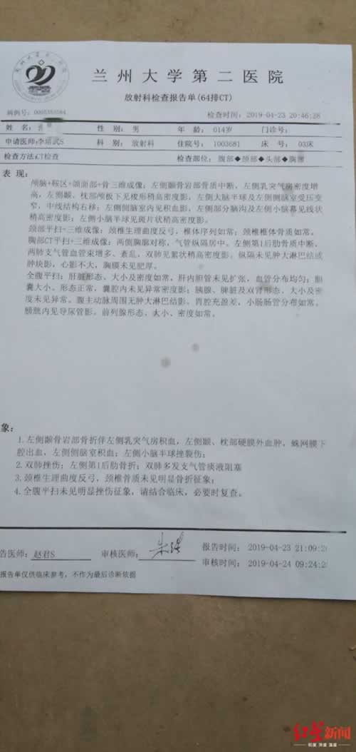 “老师是14:33通知我们家属的,当我赶到学校时,孩子已经昏迷呕吐”,何女士说,把孩子送到陇西县第一人民医院已是15:50,经医生诊断张某伤势严重,头部血管破裂,之后在医生监护下送到兰州大学第二医院,于19:40进行抢救,经过一小时努力,但最终无效死亡。