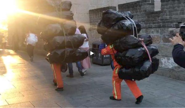 实拍八达岭长城游客暴增垃圾填满环卫工一人扛5袋下山现场视频
