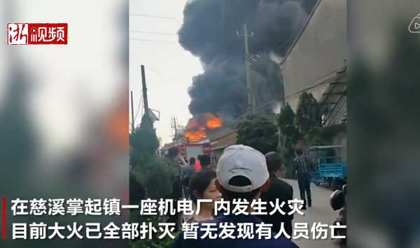 5月3日下午,慈溪掌起镇一座机电厂内发生火灾。下午4点多大火已全部扑灭,暂无发现有人员伤亡。具体起火原因正在调查中。