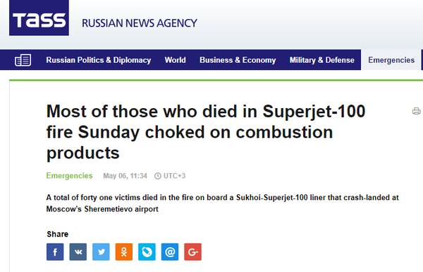 “大部分没能走下飞机的乘客,都是被燃烧产物呛死了,”消息人士说,“机上遇难者的死因将通过法医检查确定。就目前看来,似乎大多数人均死于中毒。”