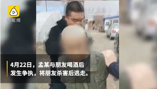 5月1日,黑龙江五大连池市。男子孟某将朋友金某杀害后,从讷河市逃走。民警调查后在五大连池一养猪场将孟某抓获。孟某称自己是被奶奶带大,金某多次辱骂自己奶奶,之后将其勒死藏在旅店床下。