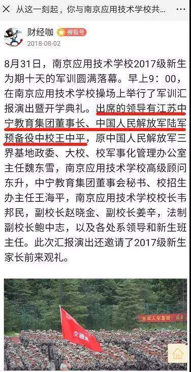 首先,南京应用技术学校在2017年军训时,出席的领导有江苏中宁教育集团董事长王中平。同时,还有个很牛逼的头衔——中国人民解放军陆军预备役中校,不知道这个头衔是真是假,反正是媒体报道的,出了事别怪我。