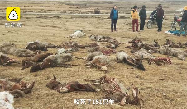4月29日,青海甘德县下藏科乡牧民家羊圈出现狼群,大约有13头狼,将151只羊咬死。现场被咬死的羊横七竖八地躺在地上,有的羊被吃的只剩下脑袋。目前,有关部门正在核实情况进行补偿并加强保护措施。
