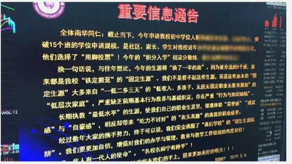 实拍深圳南华实验学校通告现低层次家庭生源划分三六九等现场视频