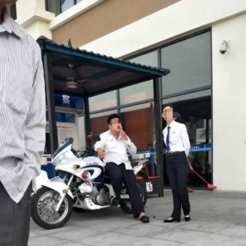 ↑邓大楣晕倒在地,裴某璟坐在警用摩托车上吸烟