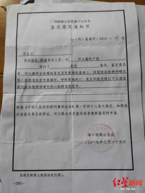 广州铁路公安局广州铁路公安局海口公安处一份编号为“公(刑)鉴通字﹝2019﹞07号”《鉴定意见书通知书》显示,邓某楣死因符合在慢性肾炎及肾衰竭的基础上,因冠状动脉粥样硬化性心脏病急性发作致循环、呼吸衰竭死亡;发生纠纷及殴打可诱发其冠心病急性发作。