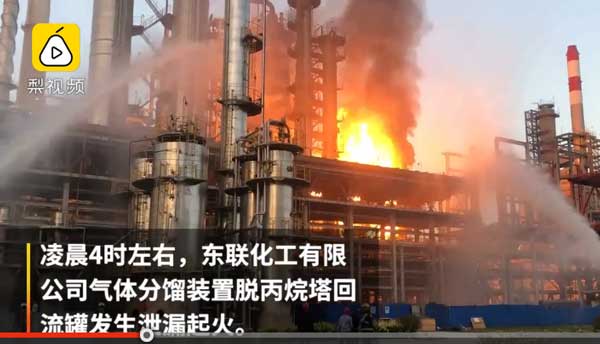 实拍泰州东联化工厂回流罐泄漏起火现场视频