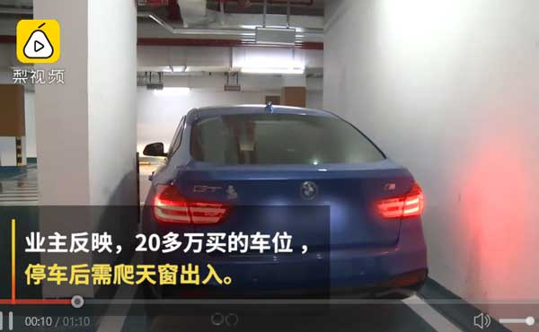 实拍南宁一业主投诉奇葩车位4个车门被卡只能爬天窗出入视频