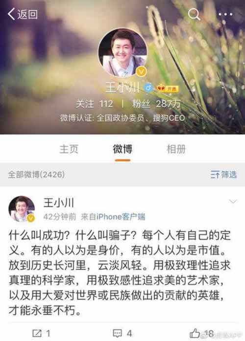 此前,孙宇晨在朋友圈中写道:2014年11月24日我和王小川录制节目,我永远也忘不了他这打量骗子的眼神。他说我是骗子,肯定会失败,和我录节目是耻辱,最后甚至没法录下去。后来不到三年我公司就超过了搜狗市值,人生中瞧不起你的对你的鞭策更加刻骨铭心。