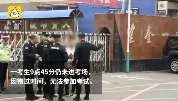 6月7日,黑龙江望奎,一名考生9点前到达考点,但因为没带表,看到考点门口没有其他考生,以为没到时间,一直在考场外等候,9点45分才反应过来。但因错过时间,最终无法进场考试,众多陪考家长鼓励他不要气馁。