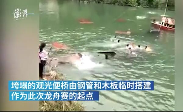 实拍湖南龙山龙舟赛浮桥垮塌致2死现场视频