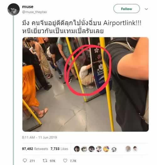 6月11日,一位泰国的网友@muse_theptas在Twitter上发文表示:一位中国女游客在曼谷的机场快线上突然原地蹲下,竟然在原地开始撒尿!
