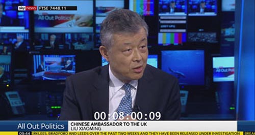 2019年6月21日,驻英国大使刘晓明接受英国天空新闻台时政栏目《政治新闻综述》(All Out Politics)主持人博尔顿直播专访,就中英关系、中英第十次经济财金对话、香港问题等阐述中方立场。