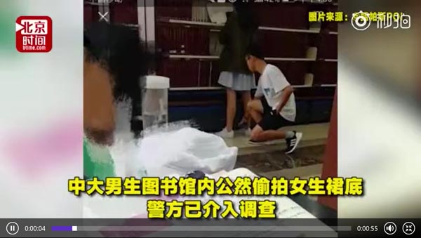 6月23日,广东广州,中山大学东校区图书馆内,一男生偷拍女生裙底时被其他同学拍下。事发时女生站在书架前看书,该男生被当场抓住。有学生指出男生是该校大一学生,曾因将偷拍视频上传至网络后被举报。时间视频多次拨打中山大学宣传部电话,均无人接听。