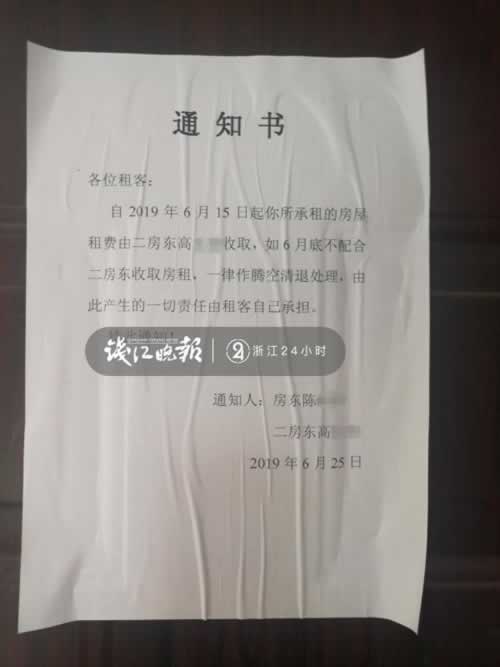 各位租客:自2019年6月15日起你所承租的房屋租费由二房东高某某收取,如6月底不配合二房东收取房租,一律作腾空清退处理,由此产生的一切责任由租客自己承担。特此通知!