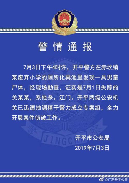 据广东省江门市开平市公安局官方微博“广东开平公安”7月3日发布的一则警情通报,7月3日下午4时许,开平警方在赤坎镇某废弃小学的厕所化粪池里发现一具男童尸体。