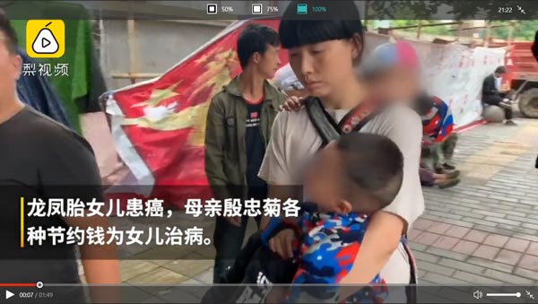 2019年7月7日,龙凤胎妈妈殷忠菊的女儿患癌,致使家庭更加拮据,殷忠菊为了节约开支给3岁女儿看病,她步行一个多小时到商店买便宜的尿不湿,并向商家讨要试用装,留给自己每月生理期使用,这样一直坚持了3年。