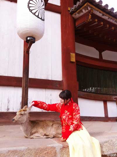 徐娇的行为引发网友的热烈讨论,对于她穿汉服去日本的行为发表自己的看法。不少网友纷纷赞徐娇好美,也有人调侃“女汉子化什么妆”,也有不少人对她的身体状况表示了关心,希望她早日康复。图为徐娇在奈良穿着另一套汉服,于东大寺前和小鹿玩耍。