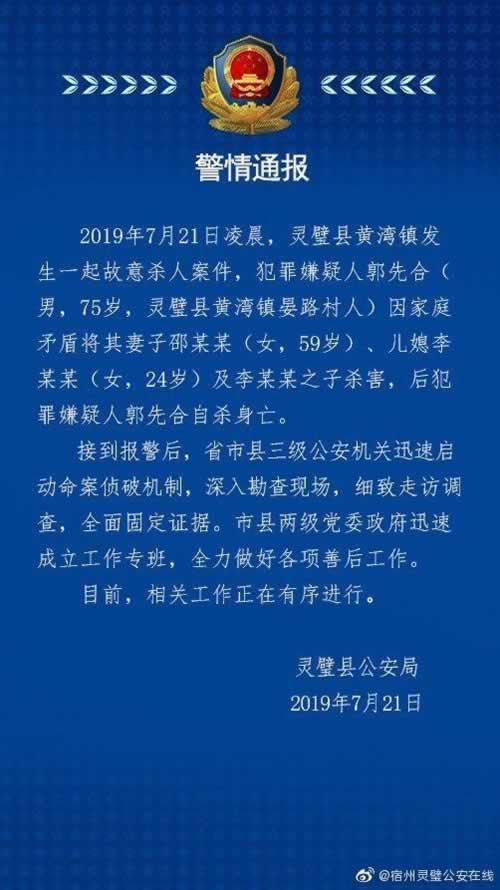 7月21日,安徽省宿州市灵璧县公安局官方微博发布了一则警情通报,称当日凌晨,灵璧县黄湾镇发生一起故意杀人案件,犯罪嫌疑人郭先合(男,75岁,灵璧县黄湾镇晏路村人)因家庭矛盾将其妻子邵某某(女,59岁)、儿媳李某某(女,24岁)及李某某之子杀害,后犯罪嫌疑人郭先合自杀身亡。
