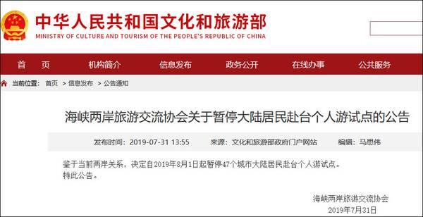 今天下午,文化和旅游部7月31日发布《海峡两岸旅游交流协会关于暂停大陆居民赴台个人游试点的公告》。公告称,鉴于当前两岸关系,决定自2019年8月1日起暂停47个城市大陆居民赴台个人游试点。