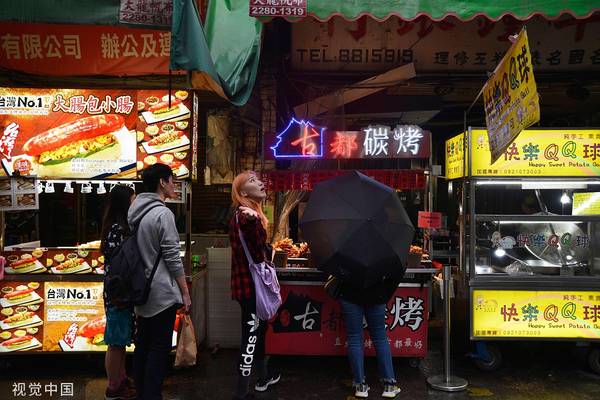 2018年11月26日,台北,一个女孩在士林夜市等商家制作自己的小吃 @视觉中国