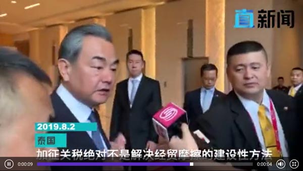 出席东盟系列外长会的国务委员兼外交部长王毅今天上午在回答深圳卫视&直新闻客户端记者关于特朗普声称将对中国商品加征关税提问时表示:我刚看到消息,加征关税绝对不是解决经贸摩擦的正确方法!早前,美国总统特朗普宣布将从9月1日对中国3000亿美元输美商品加征10%关税。