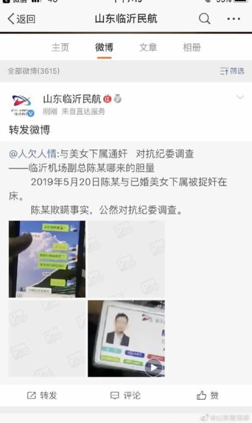 山东省临沂市民用航空管理局官方微博@山东临沂民航8月2日晚发布声明称,2019年8月2日19:13发布的“与美女下属通奸对抗纪委调查,临沂机场副总陈某哪来的胆量”博文,非临沂机场发布,系密码被盗用,目前已向公安机关报案。针对微博反映内容,纪委已介入调查。