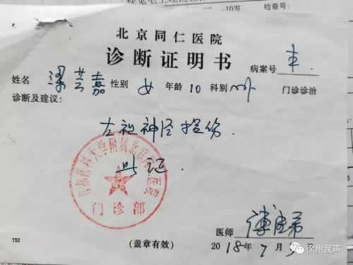 随着女儿视力恶化加剧,2018年7月,我带着女儿去了北京同仁医院,医生告知我们女儿的视力基本为0无法治愈了。我蹲在医院楼道哭了起来。一位同情我的大姐带我和孩子吃了一顿饭,并建议我去国家信访局咨询。