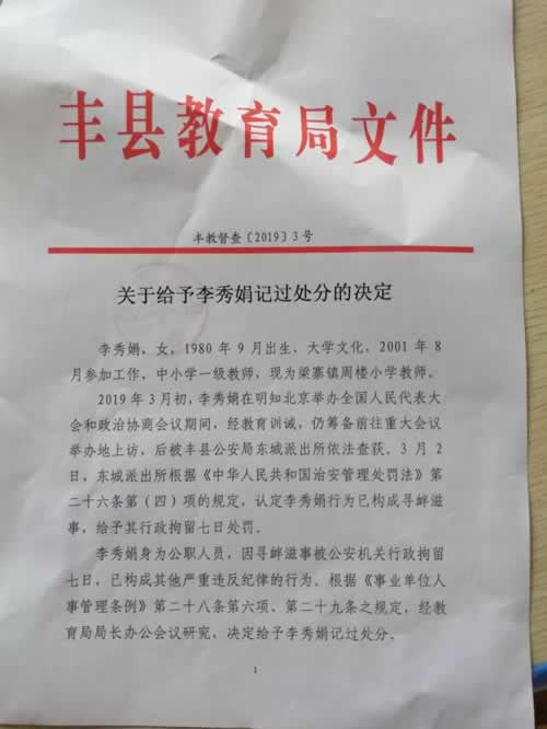 教育局在文件在处分中称我两会期间筹备进京上访,被依法查获