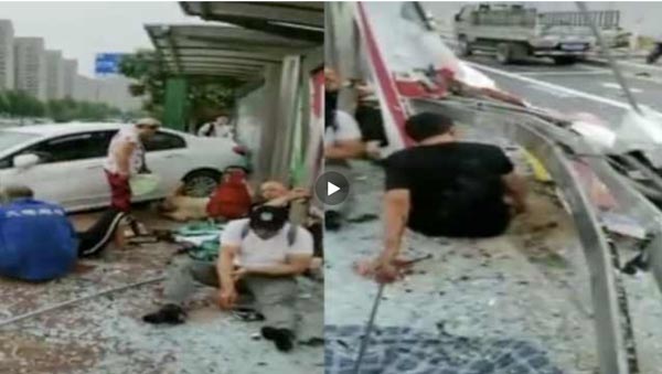 实拍郑州一轿车失控撞公交站台致7人受伤现场视频