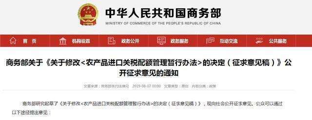 据商务部官网,8月7日,商务部研究起草了《关于修改<农产品进口关税配额管理暂行办法>的决定(征求意见稿)》(下称《征求意见稿》),现向社会公开征求意见。