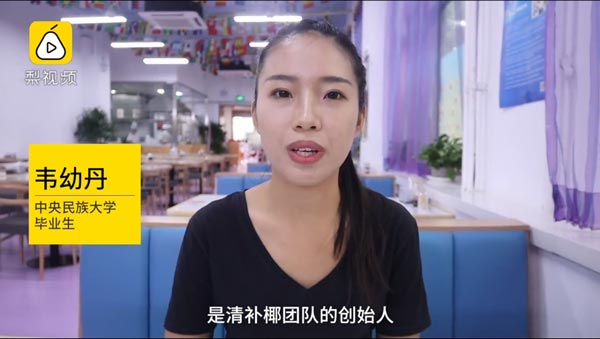 韦幼丹今年毕业于中央民族大学,是清补椰团队的创始人。创业这三年里她在外面摆过夜摊,高温39度夜依旧坚持送外卖。因为创业繁忙,几乎没有娱乐时间,寒暑假只回过一次家。谈及外界评价她说:我就是一个普通人。