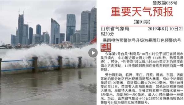 2019年8月10日,受第9号台风“利奇马”影响,山东省气象台将暴雨橙色预警信号升级为暴雨红色预警信号,预计台风于11日登陆青岛至日照沿海一带。政府及相关部门将做好放暴雨应急和抢险工作,停止集会、停课、停业。
