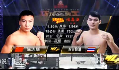 武林风2015-03-28期泰国苏吉拉潘VS中国陈志康,河南拳击三冠王1回合击倒对手3次。中国对泰国男子75公斤级比赛,苏吉拉潘22岁,184cm,75公斤级,战绩49战39胜10负。2011年河南省拳击锦标赛75公斤级冠军,2012年河南省散打锦标赛75公斤冠军,2013年河南省拳击锦标赛75公斤级冠军。以上武林风陈志康KO苏吉拉潘视频。