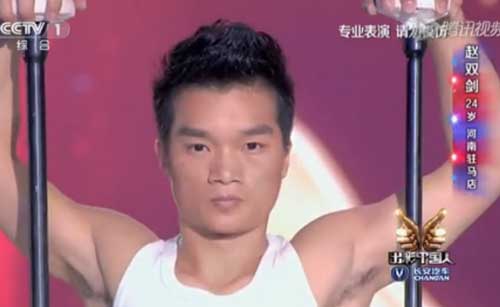 来自河南24岁的赵双剑上演了一出精彩绝伦的高空双拐表演。他在不断叠加的细棍上做出一个个高难度平衡动作,来到顶端时,左右的大幅摇摆更是让评委和观众看得目瞪口呆。精彩刺激又不失美感的高空双拐,他悬吊在半空中重现“空中飞人”景象,将力量之美、柔性之美和轻盈之美完美结合。据介绍,赵双剑的整个道具重达600斤,底座长宽3米,最高达到8米,是本季《出彩中国人》的第一个大型道具,而这个道具正是赵双剑为了登上《出彩中国人》的舞台耗时8个月和铁匠师傅一起研究完成的。“去年我看了第一季节目,让我看到了希望,那个时候就开始努力,想要参加(第二季)。”