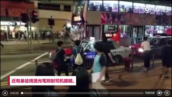 【#香港500辆的士挂上国旗# 暴徒强拆的士国旗 用激光笔照射司机眼睛】8月23日,守护香港大联盟联同香港的士司机发起“守护香港、风雨同舟”大行动 ,超过500辆香港的士司机挂上国旗,沿香港主要街道行驶。从现场视频可以看到,插着国旗的的士行经过时,竟有暴徒冲上马路强拆国旗,还有暴徒用激光笔照射司机眼睛。另据香港《明报》报道,活动当晚,由铜锣湾维园至北角港铁站一带,每当有插着国旗的的士经过,现场就有人大喝倒彩。