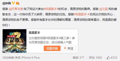 3月29日下午孙楠发微博写道:“感谢芒果洪涛给了我这次参加我是歌手的机会,请原谅我的鲁莽。感谢汪涵我的睿智老友,这一次给你添了大麻烦,请原谅我的任性。感谢我是歌手的观众对我的关心,请原谅我的老不更事。感谢所有歌手伙伴的理解和尊重,请原谅我的简单直白,我是真的爱你们!”