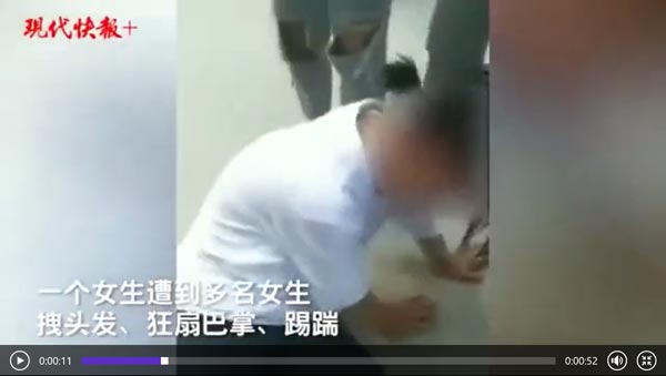 记者看到,视频一开头,就是一个施暴者对着一名身着白色T恤的女生狂扇巴掌。被打女生看起来年纪大约在十几岁。女生被扇倒在地之后,一群施暴者直接上前一把拽起女生的头发,女生瘫在地上啜泣,一个施暴者直接朝着她的背猛踹了一脚。