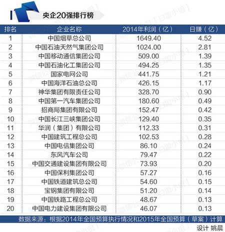 现在多了一个了解央企经营情况的途径。2015年财政部提交全国人大审议的国有资本经营预算披露了央企按比例上缴的利润情况。媒体根据比例折算,推算出了各央企的具体盈利情况,详细榜单看下图:(2014年央企20强排行榜)