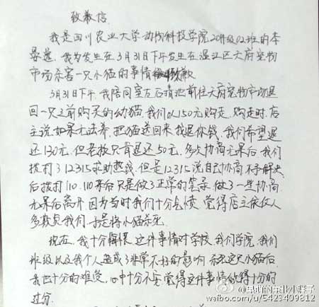 四川农业大学官方微博转发了涉事学生的致歉信。一名涉事学生称,“杀猫的事情我表示很抱歉,因为猫猫的死表示哀悼,我很难受,我的错,我不该下手杀这只猫,我不敢请求爱猫人士的原谅。对学校致歉……”