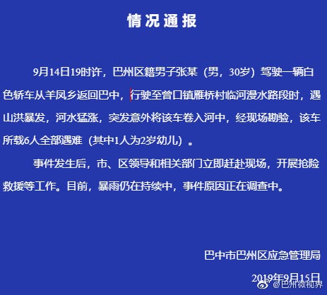 新京报快讯 据四川省巴中市巴州区人民政府新闻办公室消息,9月14日19时许,巴州区籍男子张某(男,30岁)驾驶一辆白色轿车从羊凤乡返回巴中,行驶至曾口镇雁桥村临河漫水路段时,遇山洪暴发,河水猛涨,突发意外将该车卷入河中,经现场勘验,该车所载6人全部遇难(其中1人为2岁幼儿)。