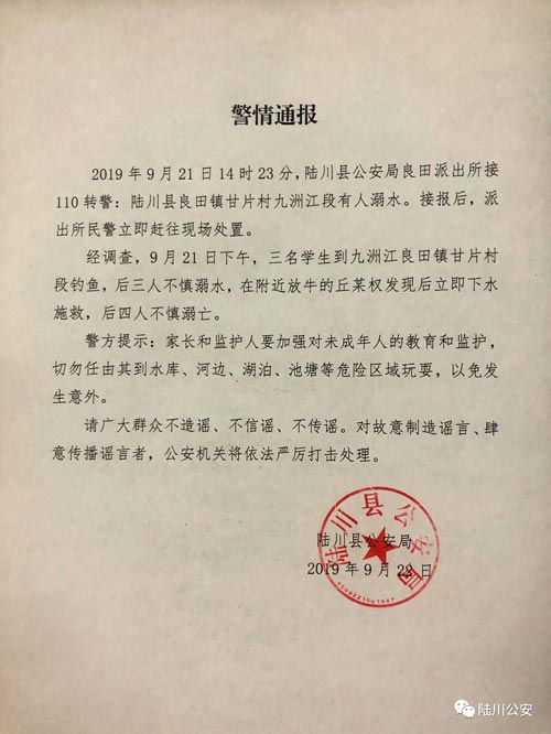 2019年9月21日14时23分,陆川县公安局良田派出所接110转警:陆川县良田镇甘片村九洲江段有人溺水。 接报后,派出所民警立即赶往现场处置。