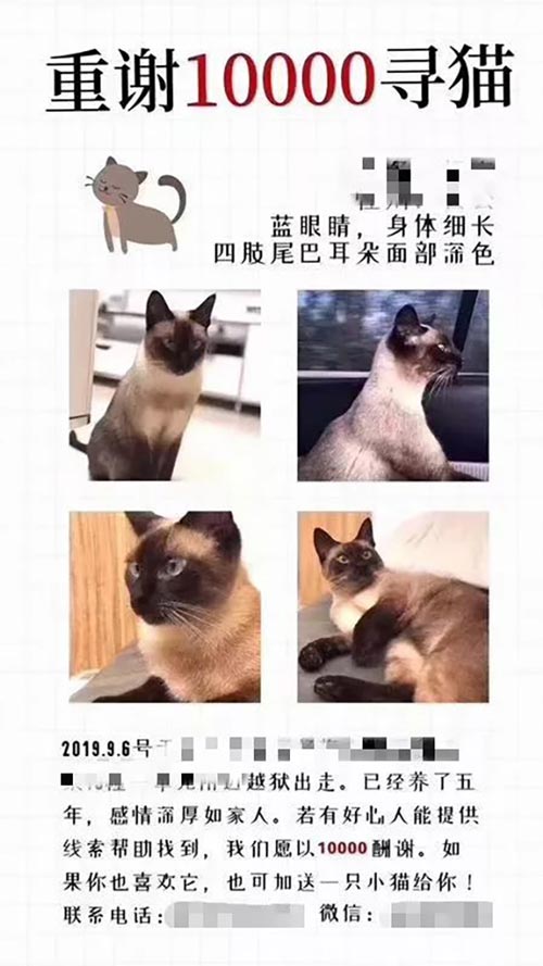 近日在微信朋友圈热传的一则寻猫启事显示,杭州一位居民养了五年的猫9月6日丢失,若有好心人能提供线索帮忙找到,该居民愿意以10000元酬谢。