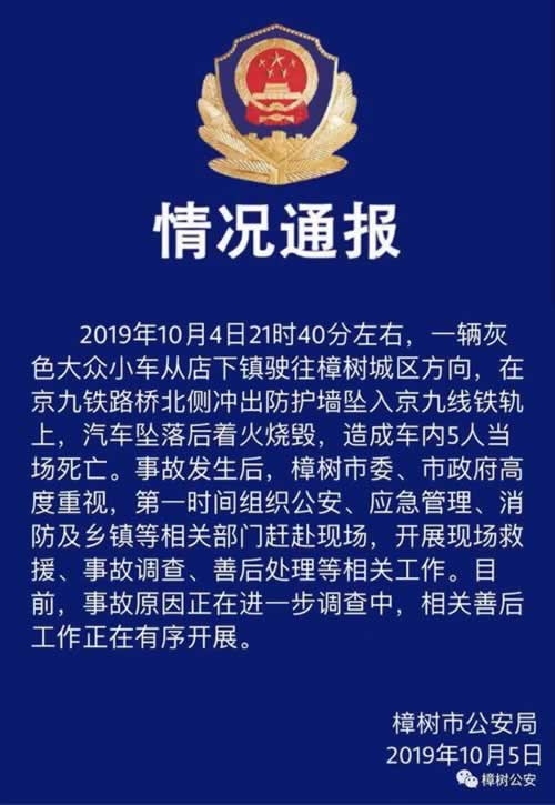 新京报快讯 据樟树市公安通报,10月4日,一辆灰色大众小车从店下镇驶往樟树城区方向,在京九铁路桥北侧冲出防护墙坠入京九铁轨上,汽车坠落后着火烧毁,造成车内5人当场死亡。以下为关于此事通报全文: