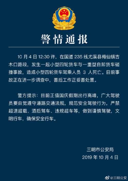 福建省三明市公安局4日晚间发布警情通报:10月4日12:30许,在国道235线尤溪县梅仙镇吉木口路段,发生一起小型四轮货车与一重型自卸货车碰撞事故,造成小型四轮货车驾乘人员3人死亡。目前事故正在进一步调查中,善后工作正妥善处置。