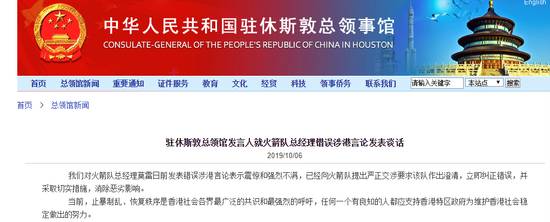 原标题:驻休斯敦总领馆发言人就火箭队总经理错误涉港言论发表谈话