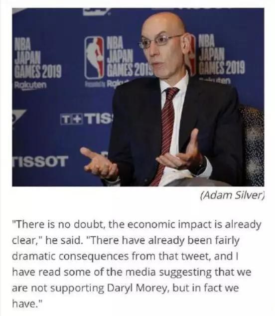 亚当·肖华表示:“毫无疑问,经济上的影响已经很明显了。那条推特已经产生了相当巨大的后果,我也读到一些媒体暗示我们不支持莫雷,但事实上我们支持(莫雷)。作为一家基于价值观的组织,我要明确表示,支持莫雷的方面是,让他能够行使他的言论自由。”