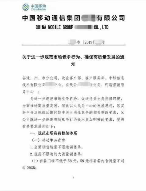 这份内部文件是中国移动下发到各个子公司,主题是“关于进一步规范市场竞争行为、确保高质量发展的通知”,而文件中着重显示了这几个细节:
