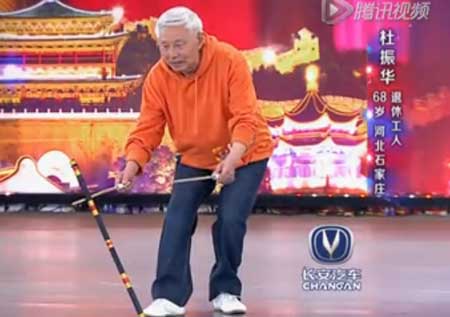 其中来自河北石家庄68岁的杜振华的老爷爷,带着他独创的一套“龙凤棍”博得了满堂彩 。只见两短一长,三根普普通通的棍子,在老爷爷的手中却能够上下翻飞。如此灵活的表演,令三位评委都忍不住上台一试。