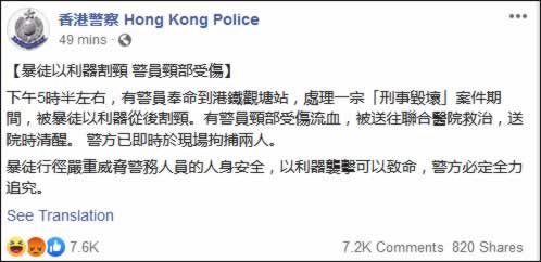 香港警方13日发布声明,当天下午5时半左右,有警员奉命到港铁观塘站,处理一宗“刑事毁坏”案件期间,被暴徒用利器从后割颈。有警员颈部受伤流血,被送往联合医院救治,送院时清醒。 警方已实时于现场拘捕两人。